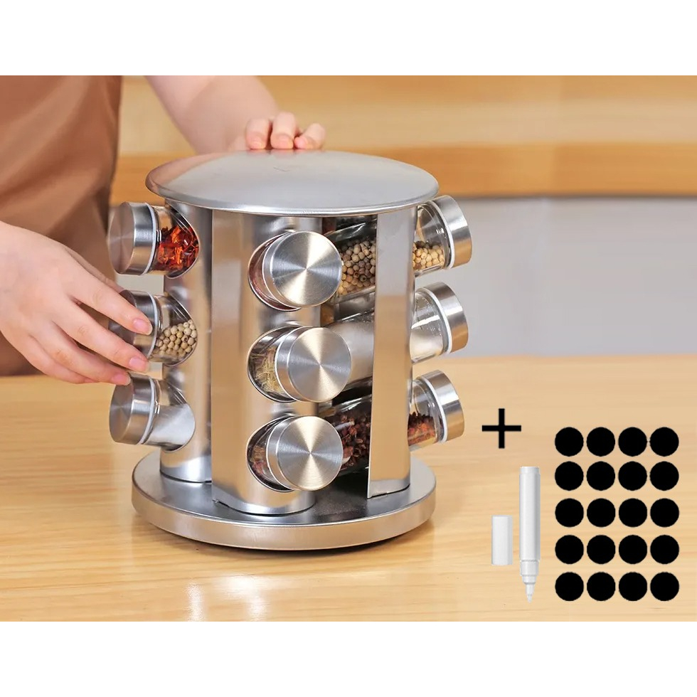 ######################## CARACTERÍSTICAS DO PRODUTO ######################## - Base giratória com teto giratório, permitindo fácil rotação de 360º. - Produto feito em Aço Inox Escovado - Possui 12 Potes de 80g - Acabamento em Aço Escovado Medidas do Porta Tempero 12 Potes: ↕ Altura: 22 cm ↔ Comprimento: 23 cm ↖ Comprimir: 20 cm ↨ Peso: 1,75 kg Medidas da Caixa Porta Tempero 12 Potes: ↕ Altura: 24 cm ↔ Comprimento: 27 cm ↖ Compressão: 21 ↨ Peso: 1,85 kg Medidas do Pote Vidro (Armazenagem do tempero) - Altura: 9 cm - Diâmetro: 4 cm - Capacidade de Armazenamento Pote de Vidro: Aprox. 80g ######################## OBSERVAÇÃO ######################## Para a preservação de seu produto, todos os potes de vidro contém uma película protetora de cor azul, para evitar arranhões ou qualquer tipo de daño no transporte. Basta retirar a película e seu produto estará pronto para uso. Qualquer dúvida, estamos à disposição. Conte conco, :)